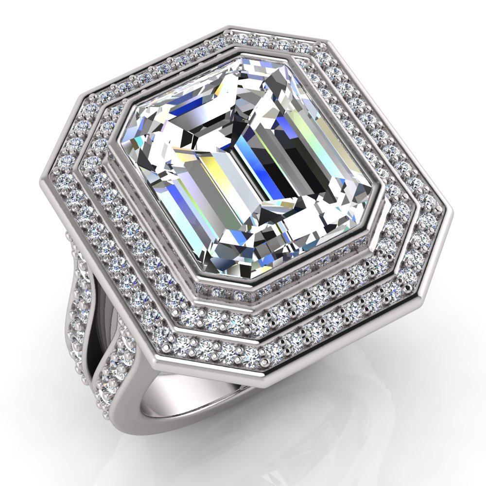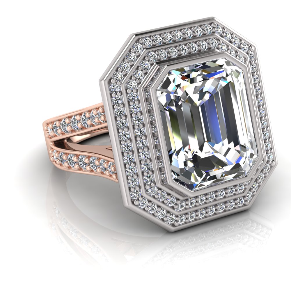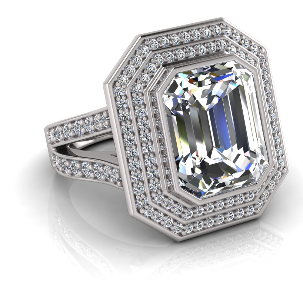 Emerald Bezel Set & Double Halo Pave Set Ring
