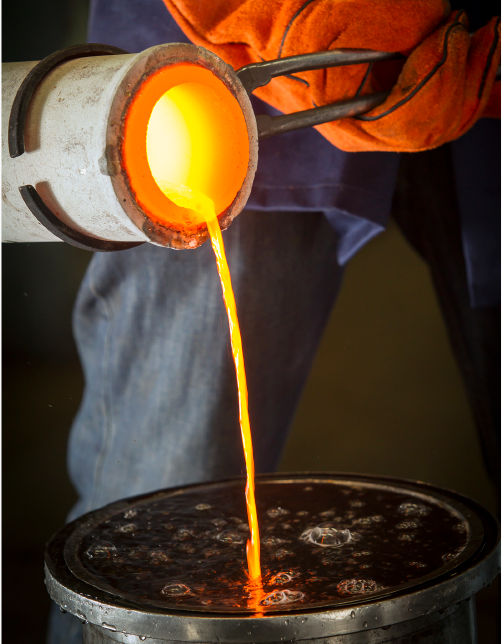 The melt is poured into a mold where the metal settles to the bottom and the slag created by the flux remains on top taking some of the non-metallic impurities with it.
